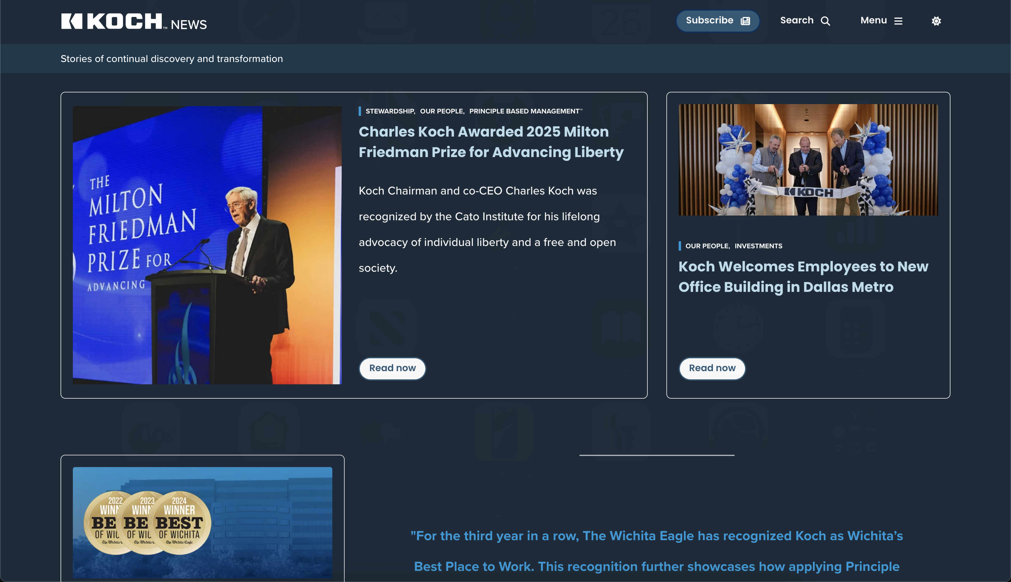 The current version of this site marks the second major iteration I’ve helped bring to life. Originally a shared resource within KochInc.com, it was rebuilt as one of our first headless websites—initially using Gatsby, then later migrated to Next.js. In addition to contributing to the site's development, I created a custom solution to export and migrate content from the legacy system into the new platform, as no off-the-shelf tool existed for the job. It was a challenging but rewarding piece of work that laid the foundation for a smooth transition. Today, the site stands as Koch Industries' primary news and media hub, delivering company stories and updates with flexibility, speed, and modern architecture.