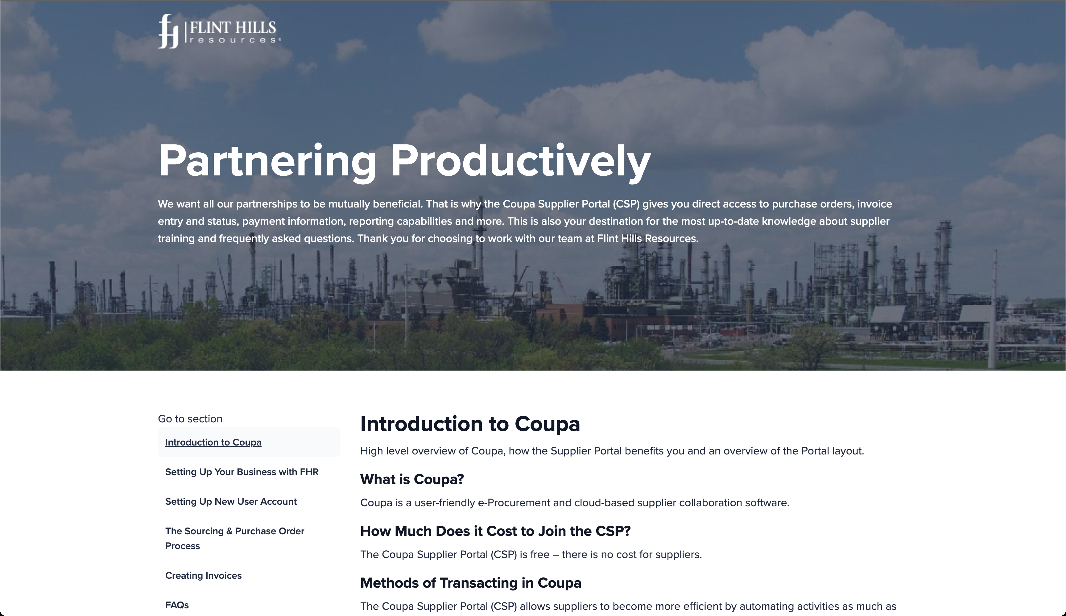 Launched shortly after the main FHR site, this platform supports the Coupa Supplier Portal and serves as a central hub for supplier-facing documentation, FAQs, and onboarding resources. Like FHR.com, I was responsible for both front-end and back-end development, as well as deployment and ongoing maintenance. The project emphasized clarity and usability, ensuring vendors could easily find the information they need.